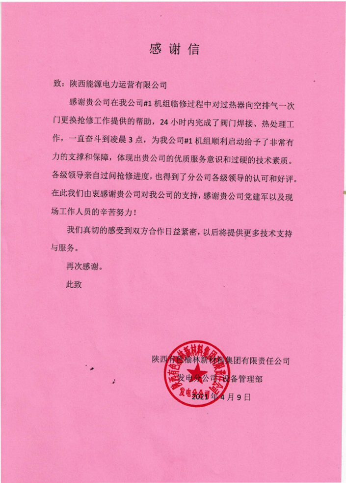 五一”剛過,公司收到陜西有色榆林新材料集團(tuán)有限責(zé)任公司的表揚(yáng)信。