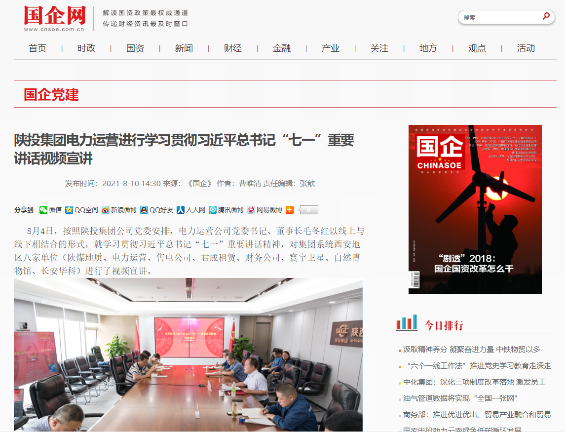 8月4日,按照陜投集團公司黨委安排,電力運營公司黨委書記、董事長毛冬紅以線上與線下相結合的形式,就學習貫徹習近平總書記“七一”重要講話精神,對集團系統(tǒng)西安地區(qū)八家單位(陜煤地質、電力運營、售電公司、君成租賃、財務公司、寰宇衛(wèi)星、自然博物館、長安華科)進行了視頻宣講。