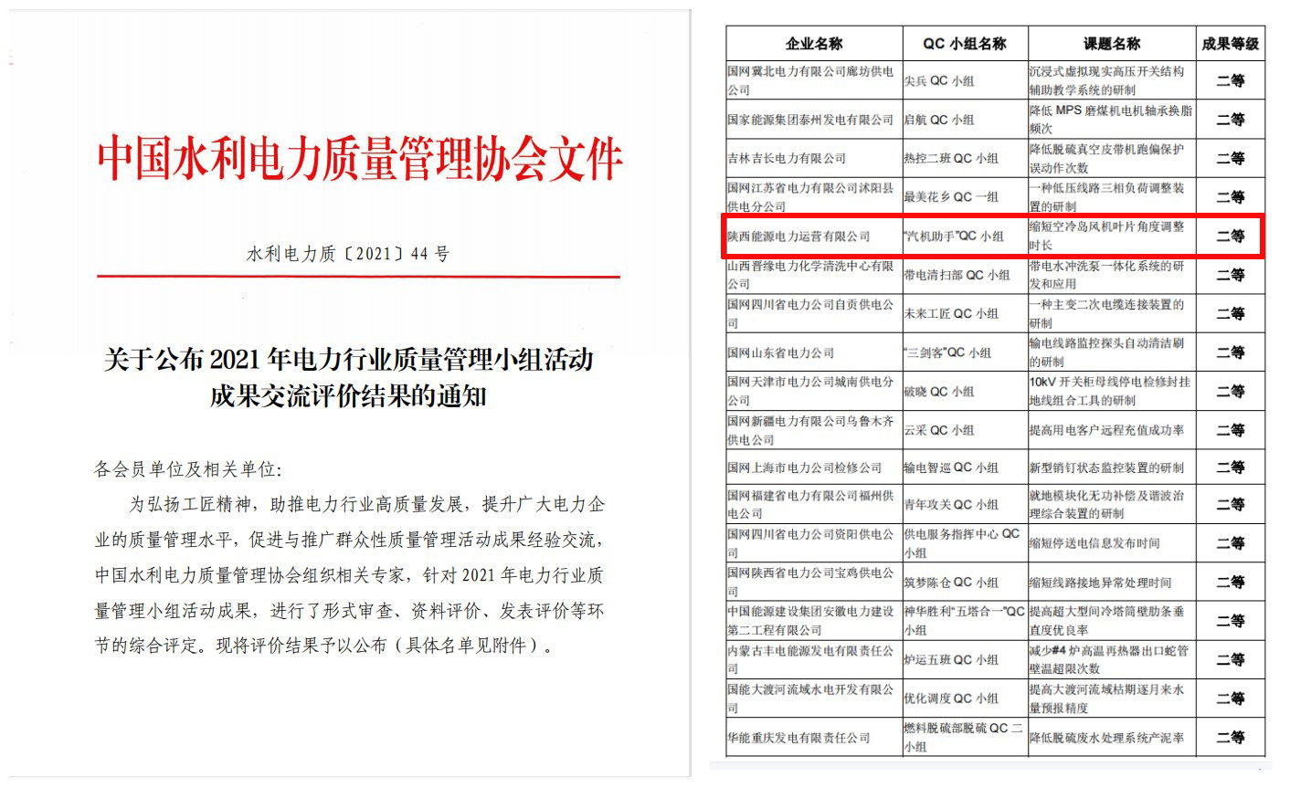 日前,中國水利電力質(zhì)量管理協(xié)會公布了2021 年電力行業(yè)質(zhì)量管理小組活動成果獲獎名單,公司QC成果從來自全國電力行業(yè)各單位的1129項優(yōu)秀成果中脫穎而出,斬獲二等獎。該成果先后獲得2020年度陜西省電力行業(yè)協(xié)會質(zhì)量管理小組活動一等獎、“秦創(chuàng)原·涇河新城杯”2021年陜西省創(chuàng)新方法大賽三等獎等。依托該成果研制的“一種空冷島風機葉片角度測量專用工具”已取得國家實用新型專利授權。