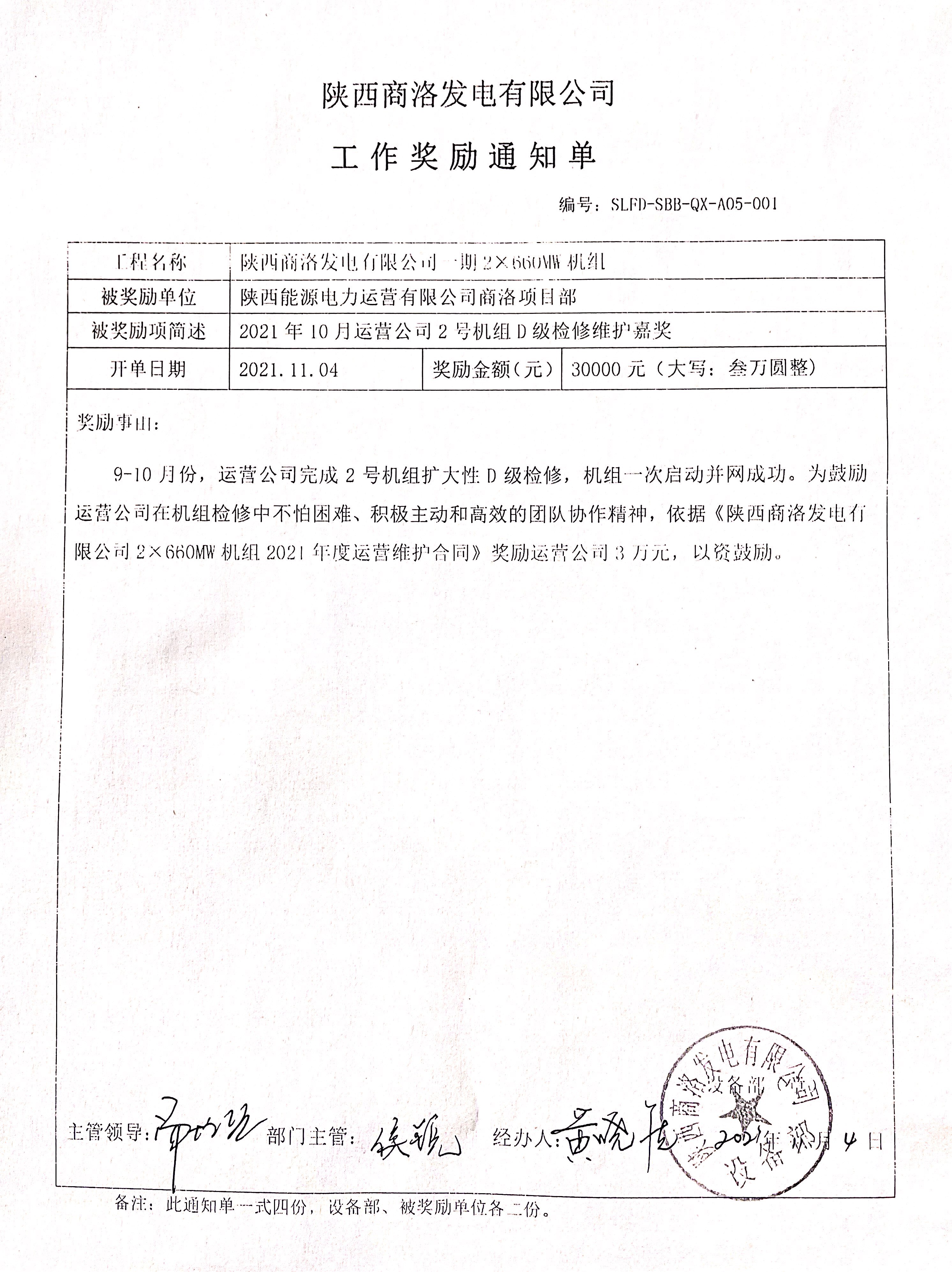 近日,商洛項目部收到來自商洛發(fā)電公司的獎勵單通知單,獎勵金額共計30000元,展現(xiàn)了業(yè)主方對項目部在此次#2機組擴大性D修中不畏艱難、勇于擔當?shù)摹斑\營鐵軍”的充分肯定。