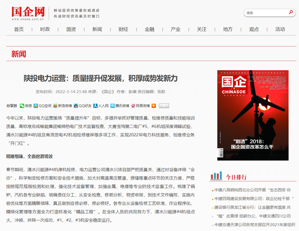 今年以來,電力運(yùn)營(yíng)公司圍繞“質(zhì)量提升年”目標(biāo),多措并舉抓好管理質(zhì)量、檢維修質(zhì)量和技能培訓(xùn)質(zhì)量,高標(biāo)準(zhǔn)完成榆能集團(tuán)榆神熱電廠技術(shù)監(jiān)督檢查、大唐寶雞第二電廠#5、#6機(jī)組深度調(diào)峰試驗(yàn)、清水川能源#4機(jī)組及商洛發(fā)電#2機(jī)組檢修維保等多項(xiàng)工作,實(shí)現(xiàn)2022年電力科技服務(wù)、檢維修業(yè)務(wù)“開門紅”。