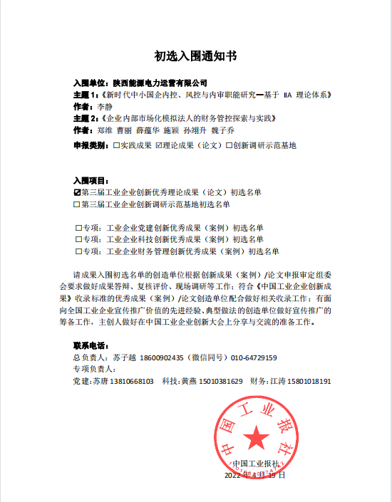 近期,公司《企業(yè)內(nèi)部市場化模擬法人的財(cái)務(wù)管控探索與實(shí)踐》與《新時(shí)代中小國企內(nèi)控、內(nèi)控與內(nèi)審職能研究—基于IIA理論體系》兩篇論文,成功入圍中國工業(yè)報(bào)社第三屆工業(yè)企業(yè)創(chuàng)新優(yōu)秀理論成果(論文)初選名單。