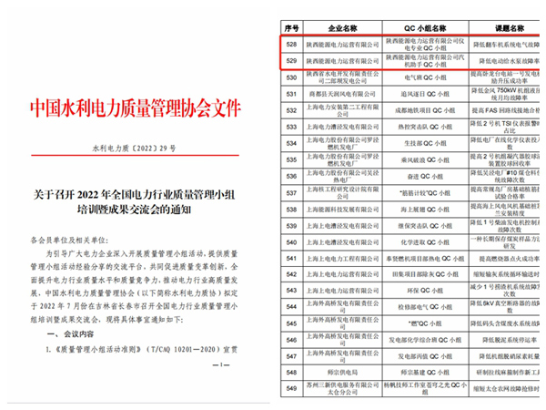日前,中國水利電力質(zhì)量管理協(xié)會(huì)公布了2022年電力行業(yè)質(zhì)量管理小組活動(dòng)成果交流名單。商洛項(xiàng)目部儀電專業(yè)QC小組《降低翻車機(jī)系統(tǒng)電氣故障率》、清水川項(xiàng)目部汽機(jī)助手QC小組《降低電動(dòng)給水泵故障率》等兩項(xiàng)QC成果成功入圍。