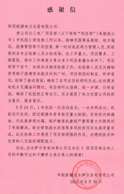 6月21日,吉木薩爾發(fā)電發(fā)來感謝信,對公司高效優(yōu)質(zhì)完成#1機組C修項目表示感謝。
