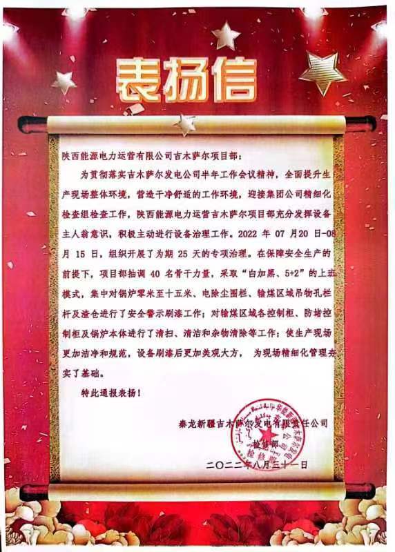 9月1日,公司相繼收到吉木薩爾發(fā)電檢修部、商洛發(fā)電設(shè)備部發(fā)來(lái)的表?yè)P(yáng)信,對(duì)吉木薩爾項(xiàng)目部高效優(yōu)質(zhì)完成為期25天的設(shè)備專項(xiàng)治理和商洛項(xiàng)目部鍋爐班加班加點(diǎn)完成搶修表示感謝。