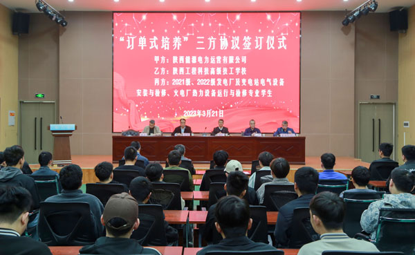3月21日,公司與陜西工程科技高級技工學校舉行“訂單式培養(yǎng)”三方協(xié)議簽訂儀式,接受委培的4個“電力運營訂單班”(電力系統(tǒng)班、熱電班、新能源及電氣班)共200余名學生參加活動?!坝唵伟唷毙F蠛献髂J绞枪韭?lián)合集團內(nèi)部優(yōu)質(zhì)培訓平臺為企業(yè)人才梯隊建設(shè)布新局、拓新路的重要舉措,是有效促進教育鏈、產(chǎn)業(yè)鏈、人才鏈與創(chuàng)新鏈有機銜接的積極探索。陜西工程科技高級技工學校黨委負責人、校長李若飛、副校長穆廣利、趙利參加簽訂儀式。