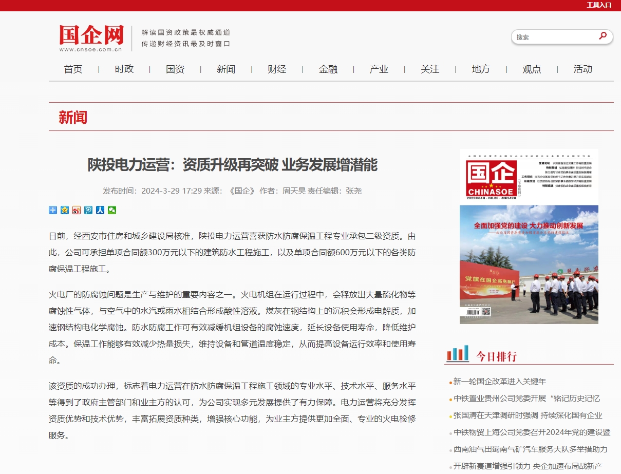 該資質的成功辦理,標志著電力運營在防水防腐保溫工程施工領域的專業(yè)水平、技術水平、服務水平等得到了政府主管部門和業(yè)主方的認可,為公司實現(xiàn)多元發(fā)展提供了有力保障。電力運營將充分發(fā)揮資質優(yōu)勢和技術優(yōu)勢,豐富拓展資質種類,增強核心功能,為業(yè)主方提供更加全面、專業(yè)的火電檢修服務。
