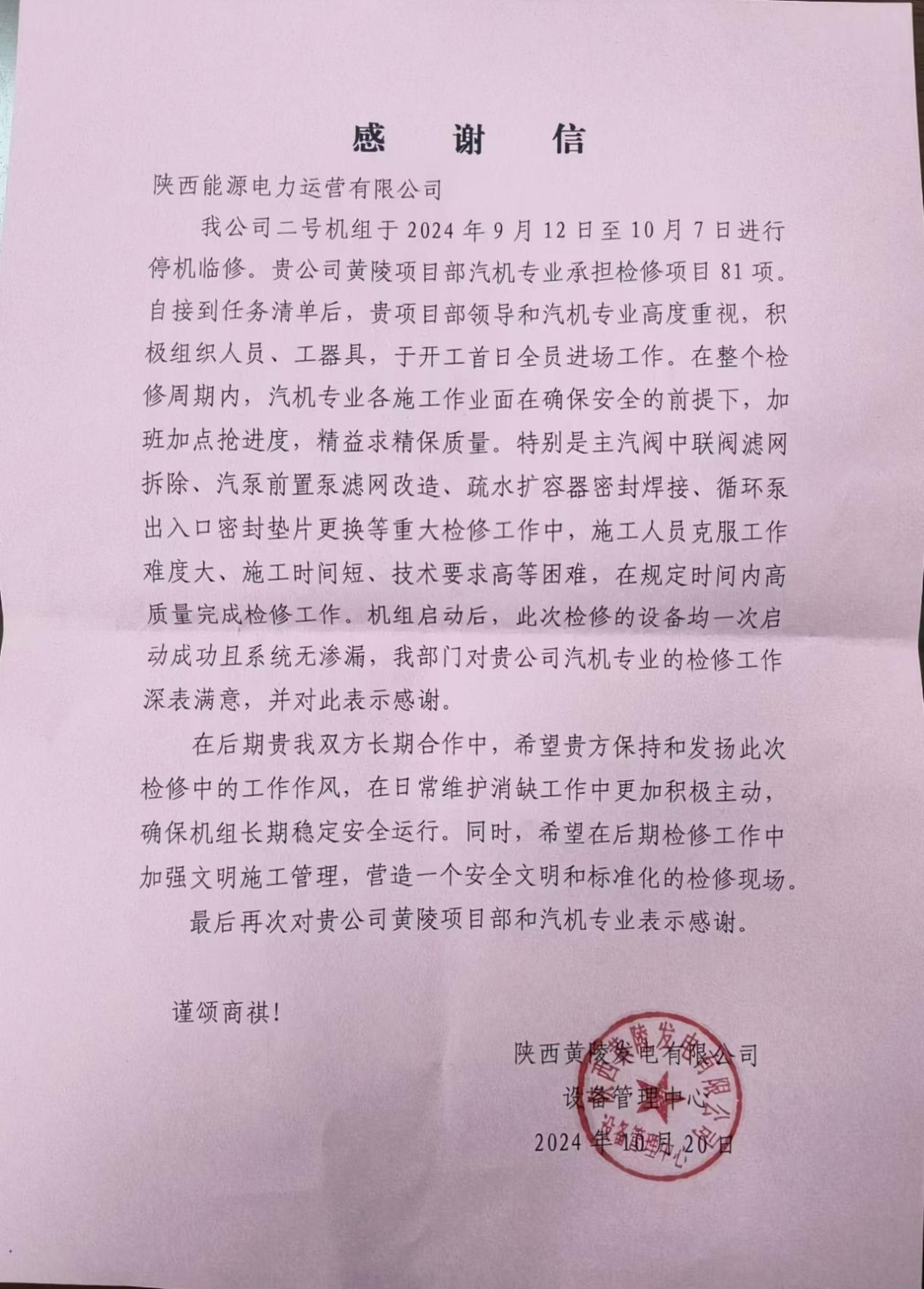 10月20日,黃陵項目部收到業(yè)主發(fā)來的感謝信,對項目部高質(zhì)量完成#2機組臨修工作給予高度認可。