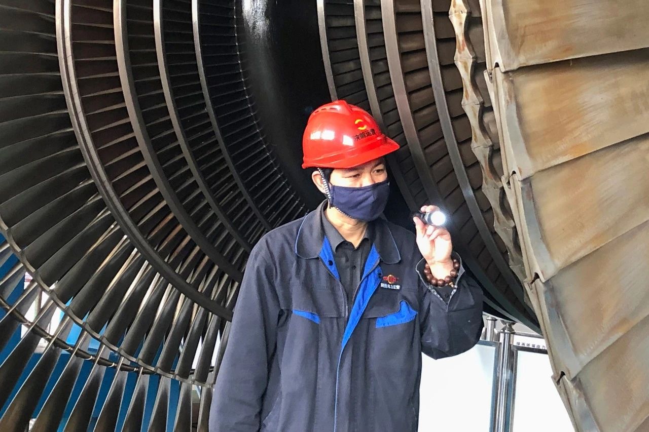 3月13日,渭河項目部機(jī)務(wù)隊主機(jī)班詹涇永在檢查汽輪機(jī)葉片