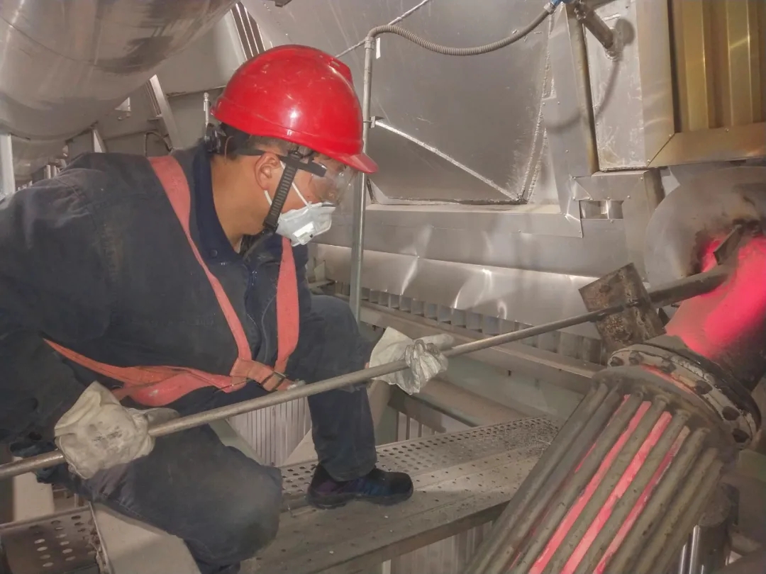 一天,正吃中午飯的崔登鋒突然接到緊急消缺通知,他撂下飯盒,就奔向現(xiàn)場。工作現(xiàn)場落渣管的溫度高達400℃,煤粉隨著陣陣熱浪撲面而來,崔登鋒完全顧不上這些,眼睛一直盯著缺陷,手中緊握的鋼釬一刻也不停下來。就這樣持續(xù)奮戰(zhàn)了五個小時后,直到險情排除,他的臉上才露出笑容。
