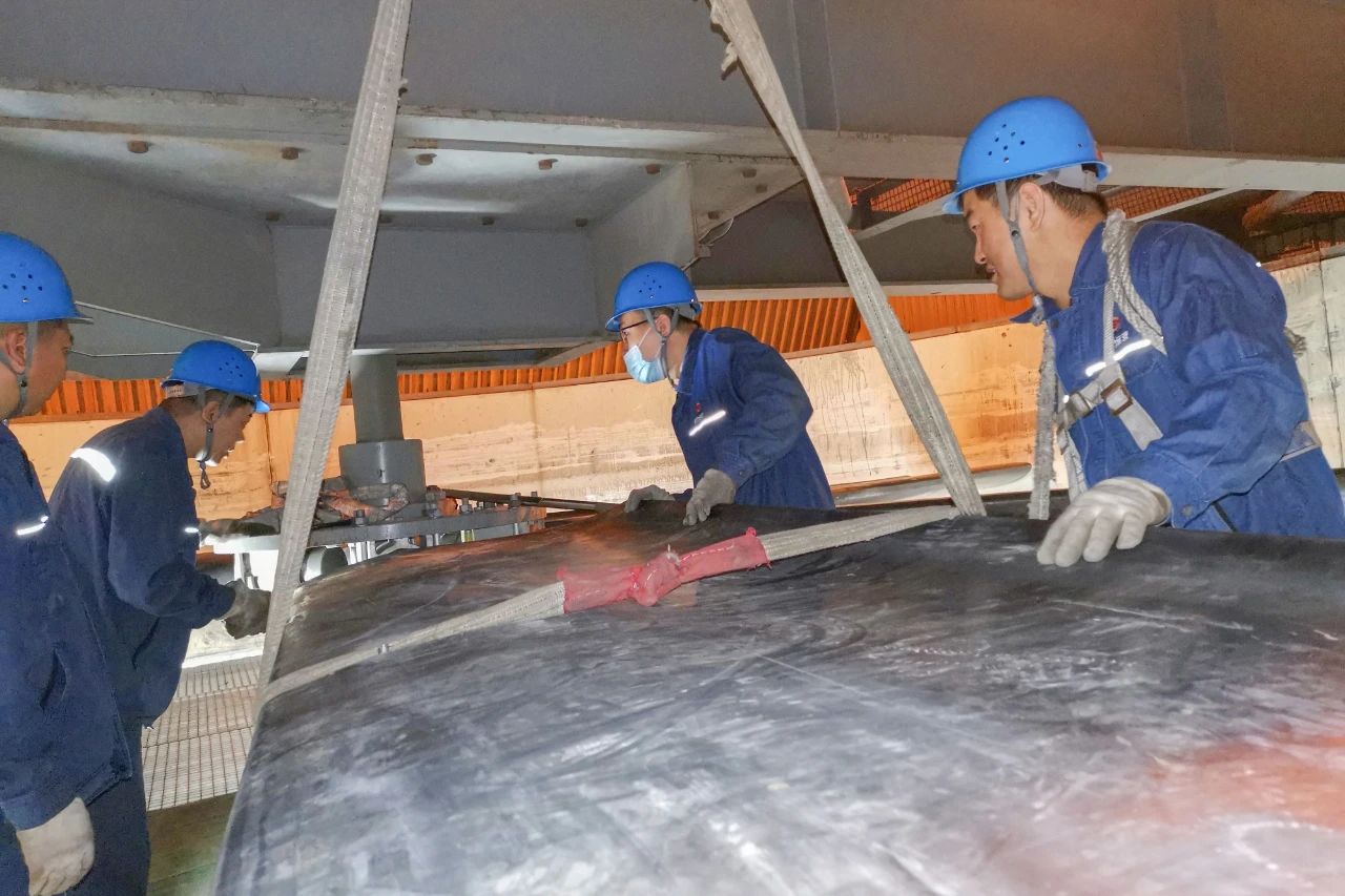 工作現(xiàn)場,需要更換的每根葉片重達(dá)500斤,且施工作業(yè)面在距離地將近50米的高空,難度可想而知。項(xiàng)目部從各班組抽調(diào)的人員緊急支援。在空冷島風(fēng)機(jī)高分貝噪音的“狂轟濫炸”以及近70℃熱浪的“侵襲”下,全體搶修人員加班加點(diǎn)拆卸破損葉片,協(xié)調(diào)備件,回裝葉片,各項(xiàng)工作在有條不紊地進(jìn)行著。